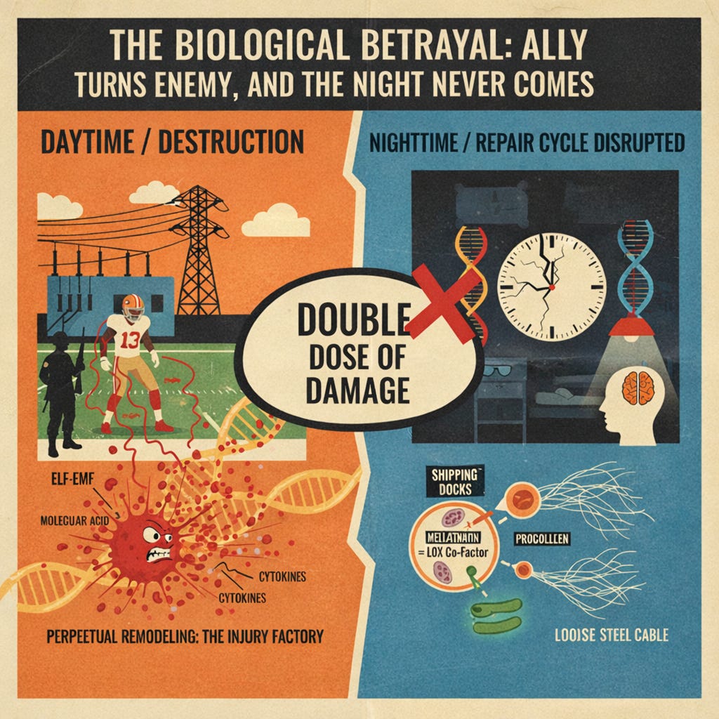 In Parts 1 and 2, we established the 49ers’ unique exposure to ELF magnetic fields from the substation next to their practice fields and explained how these fields disrupt the mitochondrial electron transport chain and flood cells with calcium, leading to dehydrated, brittle collagen. But the damage doesn’t stop at cellular energy production and oxidation—there’s an immune mechanism happening too, turning the body’s defenders against its own tissues while robbing cells of the nightly repair they need to stay resilient.