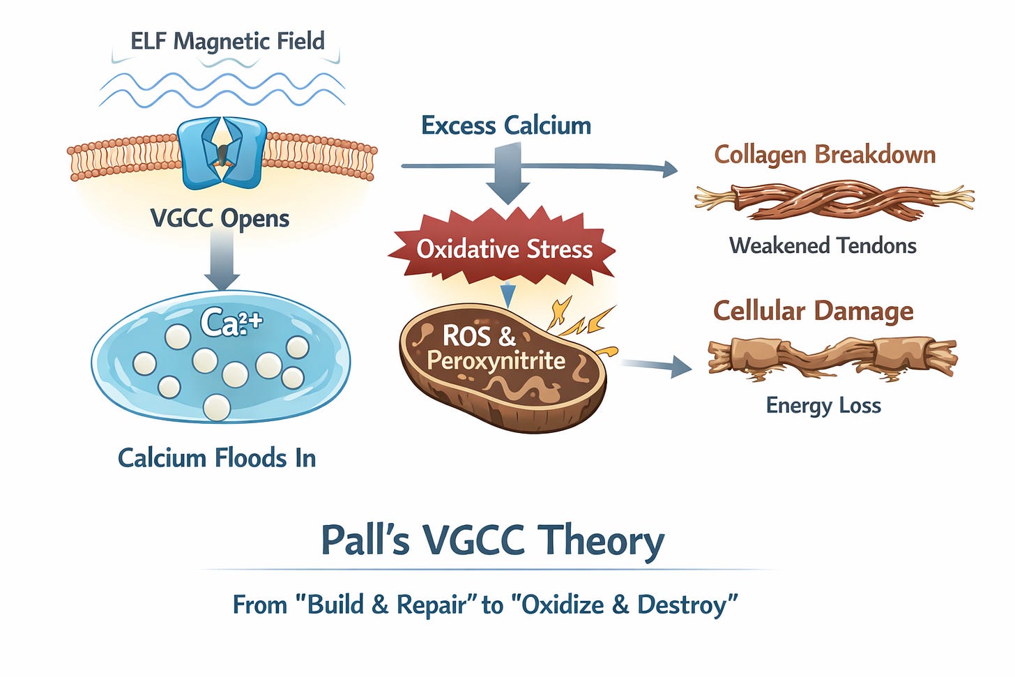 To break it down simply: normal calcium signals “build and repair.” Too much screams “oxidize and destroy”—scarring the collagen scaffolding while crippling the energy factories that keep tissues alive. Over months, tendons that should be steel cables become more like frayed string.